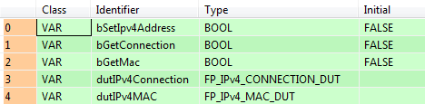 END_VARDans cet exemple, les paramètres de la connexion Ethernet sont spécifiés par s_Address. Vérifiez que les paramètres adaptés sont également entrés dans le navigateur sous . Lorsque bGetConnection est TRUE, les paramètres de la connexion sont entrés dans le DUT FP_IPv4_CONNECTION_DUT. Lorsque bGetMac est TRUE, les paramètres de l’adresse MAC sont entrés dans le DUT FP_IPv4_MAC_DUT.