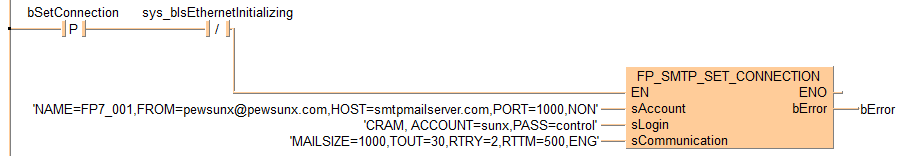FP_SMTP_SET_CONNECTION(sAccount := 'NAME=FP7_001,FROM=pewsunx@pewsunx.com,HOST=smtpmailserver.com,PORT=1000,NON',