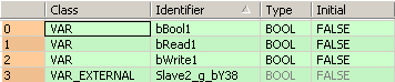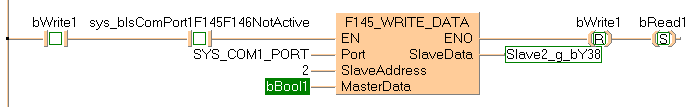 END_VARLa variable système sys_bPulse1s est copiée vers bBool1. Lorsque bWrite1 et sys_bIsComPort1F145F146NotActive sont définies sur TRUE, bBool1 est écrite vers la sortie Y38 de l’esclave 2.