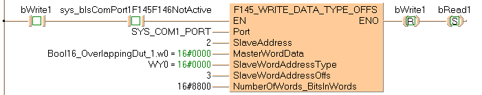 END_VARLa variable système sys_bPulse1s est copiée vers bBool1 et Bool16_OverlappingDut_1.b0. Lorsque bWrite1 et sys_bIsComPort1F145F146NotActive sont définies sur TRUE, bBool1 est écrite vers la sortie Y38 de l’esclave 2 via Bool16_OverlappingDut_1.b0.