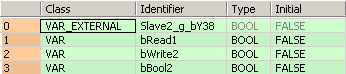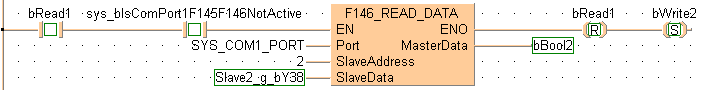 END_VARLorsque bRead1 et sys_bIsComPort1F145F146NotActive sont définies sur TRUE, la variable globale Slave2_g_bY38, qui est affectée à la sortie Y38 de l’esclave 2, est lue et sauvegardée dans bBool2.
