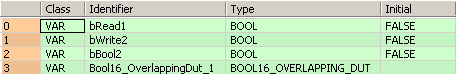 END_VARLorsque bRead1 et sys_bIsComPort1F145F146NotActive sont définies sur TRUE, la sortie Y38 de l’esclave 2 est lue et écrite vers le bit 1 de Bool16_OverlappingDut_1.w0. Ce bit est accessible via Bool16_OverlappingDut_1.b1 et copié vers bBool2.