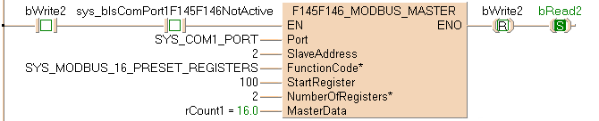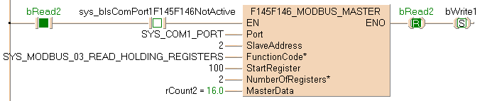 Exécution de la commande Modbus 03 : lecture de 2 mots à partir d’un esclave Modbus à partir du registre de départ 100 défini par la variable StartRegister. Ces 2 mots sont ensuite sauvegardés dans le maître Modbus 2 à partir de l’adresse définie par la variable rCount2. L’adresse de l’esclave est convertie en une adresse spécifique au dispositif en fonction des caractéristiques Modbus du dispositif.