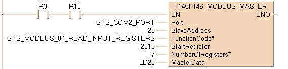 Exécution de la commande Modbus 04 : lecture de 7 mots à partir d’un esclave Modbus à partir du registre de départ 2018 défini par la variable StartRegister. Les 7 mots sont ensuite sauvegardés dans le maître à partir de LD25 défini par la variable MasterData. L’adresse de l’esclave est convertie en une adresse spécifique au dispositif en fonction des caractéristiques Modbus du dispositif.