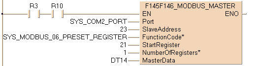 Exécution de la commande Modbus 06 : écriture d’1 mot dans un esclave Modbus à partir de l’adresse DT14 définie par la variable MasterData. Ce mot est ensuite sauvegardé dans l’esclave Modbus à partir du registre de départ 21 défini par la variable StartRegister. L’adresse de l’esclave est convertie en une adresse spécifique au dispositif en fonction des caractéristiques Modbus du dispositif.