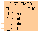 L’instruction F152_RMRD ne fait qu’accepter une demande. Le traitement réel est exécuté à la fin de la scrutation. Le drapeau de fin d’exécution de l’instruction F152_RMRD/F153_RMWT (R9036) peut être utilisé pour vérifier si l’instruction a été exécutée.