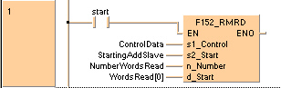s1 sauvegarde les données de contrôle pour la configuration des stations maîtres et esclaves du réseau. n mots sont lus à partir de l’adresse de la mémoire partagée du module intelligent, spécifiée par s2_Start. Le résultat est sauvegardé dans d.