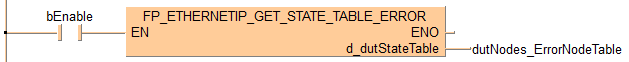 Cette instruction FP lit la table des numéros de nœuds, recherche les nœuds avec erreurs de communication cyclique et sauvegarde les valeurs dans la variable de sortie du DUT FP_ETHERNETIP_STATE_TABLE_DUT.