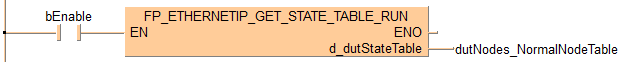 Cette instruction FP lit la table des numéros de nœuds, recherche les nœuds où la communication cyclique fonctionne normalement et sauvegarde les valeurs dans la variable de sortie du DUT FP_ETHERNETIP_STATE_TABLE_DUT.