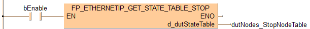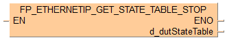Cette instruction FP lit la table des numéros de nœuds, recherche les nœuds où la communication cyclique s’est arrêtée et sauvegarde les valeurs dans la variable de sortie du DUT FP_ETHERNETIP_STATE_TABLE_DUT.
