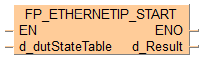 Cette instruction FP démarre le nœud sur lequel la requête de démarrage est faite et écrit le résultat dans la variable de sortie d_Result. La table des numéros de nœuds est spécifiée par FP_ETHERNETIP_STATE_TABLE_DUT.