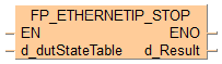 Cette instruction FP arrête le nœud sur lequel la requête d’arrêt est faite et écrit le résultat dans la variable de sortie d_Result. La table des numéros de nœuds est spécifiée par FP_ETHERNETIP_STATE_TABLE_DUT.