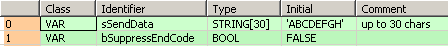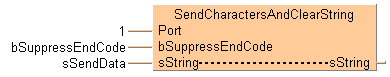 Cette instruction exécute l’instruction F159_MTRN pour envoyer des données. Les données sont contenues dans la chaîne de caractères à envoyer, appliquée à sString, une variable VAR_IN_OUT. Si bSuppressEndCode est définie sur TRUE, le délimiteur sélectionné dans les registres système n’est pas ajouté à la chaîne de caractères à envoyer.