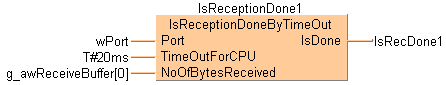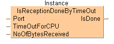 Pour le port de communication d’une unité centrale, le premier mot du tampon de réception doit être appliqué à NoOfBytesReceived (nombre d’octets reçus). Si le nombre d’octets reçus ne change pas pendant la période de temps indiquée par TimeOutForCPU, IsDone passe à TRUE.