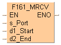Le nombre d’octets reçus est sauvegardé dans l’adresse initiale du tampon de réception, indiquée par d1_Start. Si les données reçues excèdent l’adresse finale indiquée par b2_End, une erreur de fonctionnement est détectée. Les données reçues jusqu’à d2_End sont sauvegardées. F161_MRCV permet également d’effacer le tampon de réception, de réinitialiser le drapeau "Réception terminée" et de recevoir d’autres données.