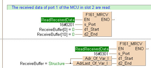 F161_MRCV est prise en charge par tous les automates : si vous utilisez des fonctions spéciales plutôt que des drapeaux, vous pouvez créer des programmes indépendants de l’automate permettant de traiter les données pour les ports de l’unité centrale aussi bien que pour ceux du module MCU. Les automates qui n’utilisent pas de ports MCU ne traduisent pas l’instruction F161_MRCV. Il est recommandé d’utiliser les fonctions ReadData ou ReadCharacters avec lesquelles votre programme se lit plus facilement.