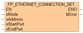 Cette instruction FP configure une connexion Ethernet spécifiée par sMode et sAddress dans l’intervalle des connexions utilisateur, spécifié par nStartPort et nEndPort. Vérifiez que les paramètres adaptés sont également entrés dans le navigateur sous .