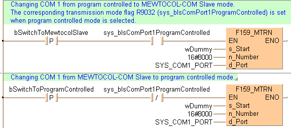 B(B_COMMENT,,Changing COM 1 from program controlled to MEWTOCOL-COM Slave mode.ø^The corresponding transmission mode flag R9032 (sys_bIsComPort1ProgramControlled) is setø^when program controlled mode is selected.,1,0,39,3,);