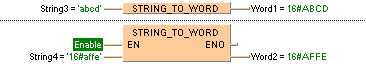 D’abord, la chaîne de caractères est convertie en une valeur du type de données STRING[32]. Ensuite, celle-ci est convertie en une valeur du type WORD via un sous-programme d’environ 270 pas, également utilisé pour les fonctions STRING_TO_INT, STRING_TO_WORD, STRING_TO_DINT et STRING_TO_DWORD.