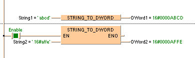 D’abord, la chaîne de caractères est convertie en une valeur du type de données STRING[32]. Ensuite, celle-ci est convertie en une valeur du type DWORD dans un sous-programme d’environ 270 pas, également utilisé pour les fonctions STRING_TO_INT, STRING_TO_WORD, STRING_TO_DINT and STRING_TO_DWORD.
