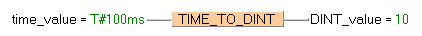 TIME_TO_DINT convertit une valeur du type de données TIME en une valeur du type de données DINT. Le temps de 10ms correspond à la valeur 1, par ex. une valeur d’entrée T#1m0s est convertie en une valeur de 6000.