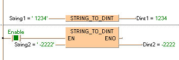 D’abord, la chaîne de caractères est convertie en une valeur du type de données STRING[32]. Ensuite, celle-ci est convertie en une valeur du type DINT dans un sous-programme d’environ 270 pas, également utilisé pour les fonctions STRING_TO_INT, STRING_TO_WORD,STRING_TO_DINT et STRING_TO_DWORD.