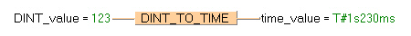 DINT_TO_TIME convertit une valeur du type de données DINT en une valeur du type de données TIME. Une valeur de 1 correspond à un temps de 10ms, par exemple, une valeur d’entrée de 123 est convertie en une valeur du type TIME T#1s230.00ms.