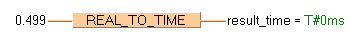 REAL_TO_TIME convertit une valeur du type de données REAL en une valeur du type de données TIME. 10ms du type de données TIME correspond à une unité REAL de 1.0, par exemple lorsque REAL = 1.0, TIME = 10ms ; et lorsque REAL = 100.0, TIME = 1s. La valeur du type de données REAL est arrondie au nombre entier le plus proche pour la conversion.