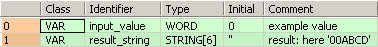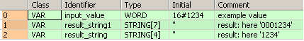 END_VARDans cet exemple, la variable d’entrée input_value du type de données WORD et la variable de sortie result_string du type STRING[4] sont déclarées.