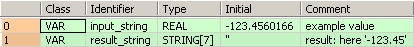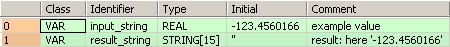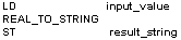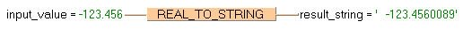 La variable input_value du type de données REAL est convertie en STRING[15]. La valeur convertie est écrite dans result_string. Lorsque la variable input_value = 123.4560166, result_string indique ' -123.4560165'.