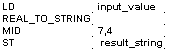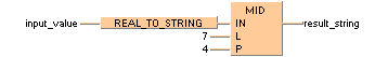 Pour exécuter cette opération, la fonction standard MID est utilisée avec la fonction REAL_TO_STRING. MID crée un secteur central dans la chaîne de caractères à partir de la position P (valeur INT) avec les caractères L (valeur INT).