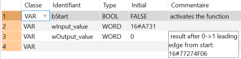 Toutes les variables d’entrée et de sortie utilisées pour programmer cette fonction ont été déclarées dans l’en-tête du POU. Le même en-tête de POU est utilisé pour tous les langages de programmation.