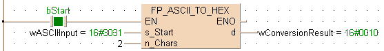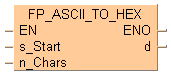 Cette instruction FP convertit les codes ASCII HEX hexadécimaux à partir de s_Start en caractères hexadécimaux lorsque le déclencheur EN est TRUE. n_Chars désigne le nombre d’octets devant être convertis.Le résultat est sauvegardé dans d.