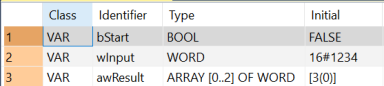 END_VARLa fonction est exécutée lorsque la variable bStart est définie sur TRUE. Deux octets à partir de s1_Start sont convertis en une valeur ASCII dans le sens inverse.