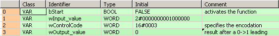 Toutes les variables d’entrée et de sortie utilisées pour programmer cette fonction ont été déclarées dans l’en-tête du POU. Le même en-tête de POU est utilisé pour tous les langages de programmation.