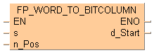 Cette instruction FP crée une colonne de bits, à partir d’une valeur indiquée en entrée s, qui est renvoyée dans l’adresse spécifiée par d_Start. La position du bit de la colonne à partir de d_Start est spécifiée en entrée n_Pos (intervalle 0–15). Cette instruction est l’instruction inverse de FP_BITCOLUMN_TO_WORD.