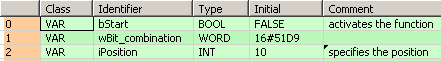 Toutes les variables d’entrée et de sortie utilisées pour programmer cette fonction ont été déclarées dans l’en-tête du POU. Le même en-tête de POU est utilisé pour tous les langages de programmation.