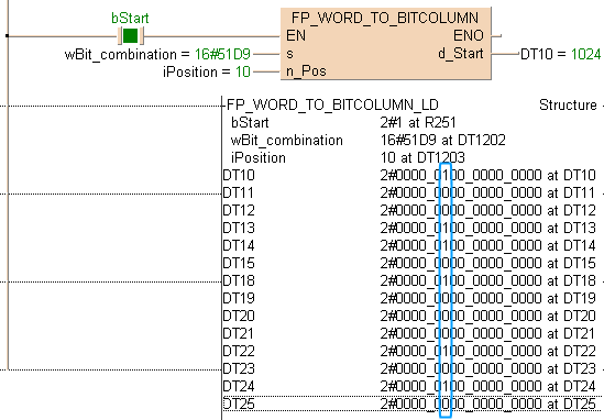 END_VARLa fonction est exécutée lorsque la variable bStart est définie sur TRUE. La ligne de bits 0101 0001 1101 1001 en entrée s est renvoyée en sortie en position de bit 10 des données à partir de DT10.