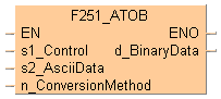 Cette fonction convertit le code ASCII sauvegardé dans la zone indiquée par s2_AsciiData en données binaires de 16/32 bits. La méthode de conversion est spécifiée par n_ConversionMethod en fonction des quatre caractères de contrôle de s1_Control. Le résultat de la conversion est sauvegardé dans la zone spécifiée par d_BinaryData.
