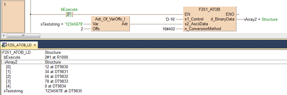 END_VARLorsque bExecute est sur TRUE, l’instruction est exécutée. Elle convertit 2 x 4 caractères ASCII décimaux en données binaires. Offset = 0 caractère ASCII (8 bits).