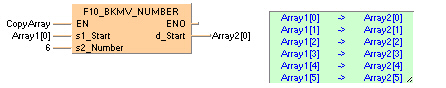 END_VARLa fonction est exécutée lorsque la variable CopyArray passe de FALSE à TRUE. Elle copie le bloc de données de la zone de départ de 16 bits désignée par s1_Start et le nombre de mots indiqué par s2_Number vers le bloc à partir de la zone de 16 bits désignée par d_Start.