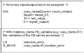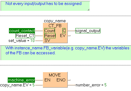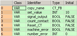 END_VARCet exemple utilise des variables. Vous pouvez également utiliser des constantes pour les variables d’entrée. Lorsqu’un front montant est détecté sur count_contact la valeur 1 est soustraite de la valeur courante EV. Signal_output est défini sur TRUE lorsque la valeur courante EV est égale à 0.