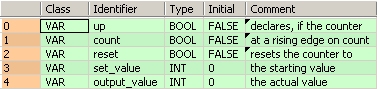 END_VARUn front montant à l’entrée Count_Trigger active le compteur. La variable booléenne à l’entrée UpDirection détermine la direction du compteur (TRUE = croissant, FALSE = décroissant). TRUE à l’entrée Reset_Preset réinitialise le compteur à sa valeur de départ.