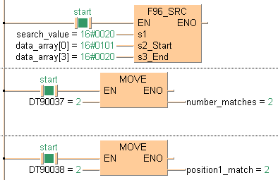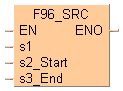 Cette fonction recherche la valeur identique à s1 dans le bloc des zones de 16 bits indiquées par s2_Start (zone de départ) et s3_End (zone finale) lorsque le déclencheur EN est TRUE.