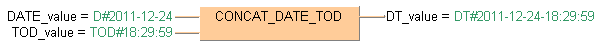 CONCAT_DATE_TOD concatène une valeur du type de données DATE avec une valeur du type de données TIME_OF_DAY. Le résultat est sauvegardé dans la variable de sortie du type de données DATE_AND_TIME.