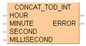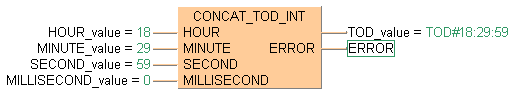 CONCAT_TOD_INT concatène des valeurs INT pour l’heure, minute, seconde et milliseconde. Le résultat est sauvegardé dans la variable de sortie du type de données TIME_OF_DAY. La sortie booléenne ERROR est activée si les valeurs d’entrée sont des valeurs de date et heure invalides.