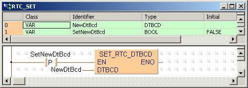 Cette instruction indépendante de l’API permet de transmettre les dates et données temporelles au format BCD (DTBCD) à l’horloge calendaire. Lorsque la variable SetNewDtBcd est définie sur TRUE, les valeurs du type de données structurées DTBCD sont écrites dans les registres spéciaux de données DT90054 à DT90056 (DT9054 à DT9056) et la valeur 16#8000 est écrite dans le registre spécial de données DT90058 (DT9058) pour paramétrer l’horloge calendaire de l’API. Vous pouvez également utiliser les variables système pour configurer l’horloge calendaire RTC. Pour accéder aux registres spéciaux de données et aux drapeaux internes spéciaux, utilisez les variables système indépendantes de l’automate.