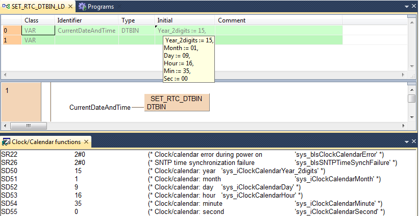 Cette instruction permet de transmettre les dates et données temporelles au format binaire DTBIN à l’horloge calendaire. Les valeurs du type de données DTBIN sont transférées vers les registres spéciaux de données SD50–SD55.