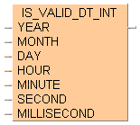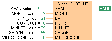 IS_VALID_DT vérifie si la combinaison des valeurs INT pour l’année, mois, jour, heure, minute, seconde et milliseconde est une valeur DATE_AND_TIME valide. Le drapeau de sortie booléen est activé lorsque la valeur date et heure est valide.