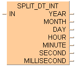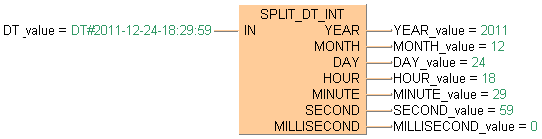 SPLIT_DT_INT répartit une valeur du type de données DATE_AND_TIME en valeurs INT pour l’année, le mois, jour, heure, minute, seconde et milliseconde.